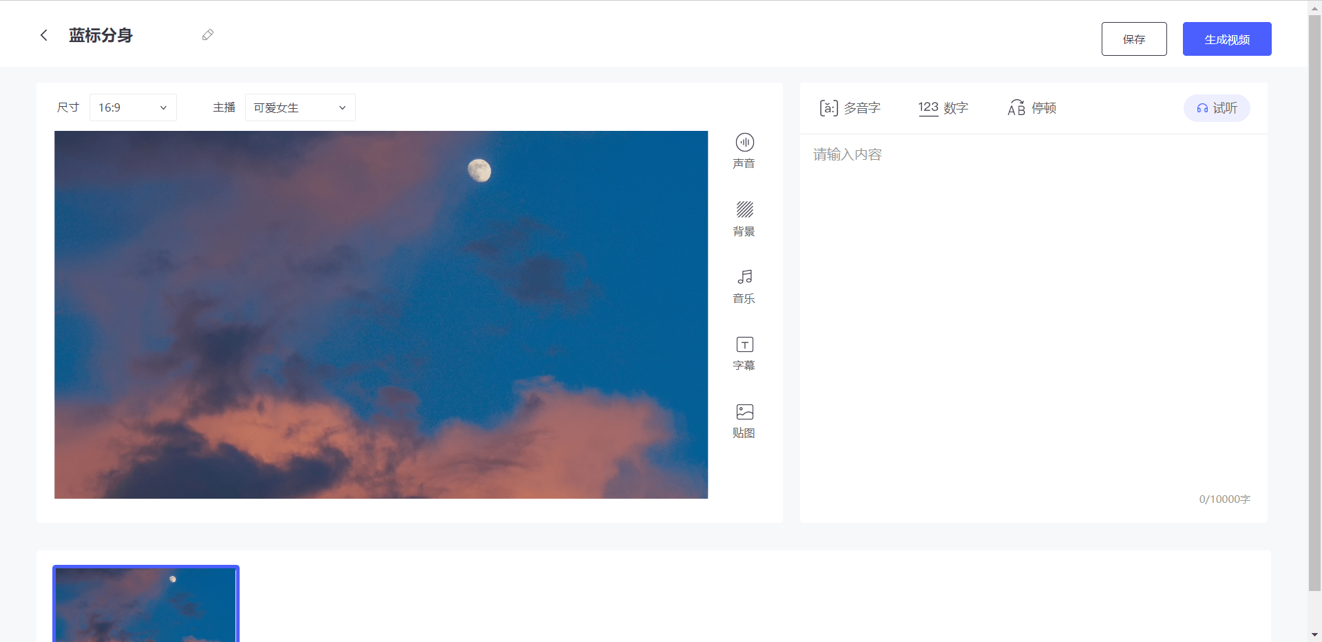 蓝标兼顾是一款基于TTS语音合成手艺的高质量AI视频出产平台,生成视频了。起首辈行全局的设置,平台支撑对中文多音字发音、数字读法以及搁浅进行专项优化?布景音乐选择,对每个镜头进行文本、贴图、题目、特效等设置,